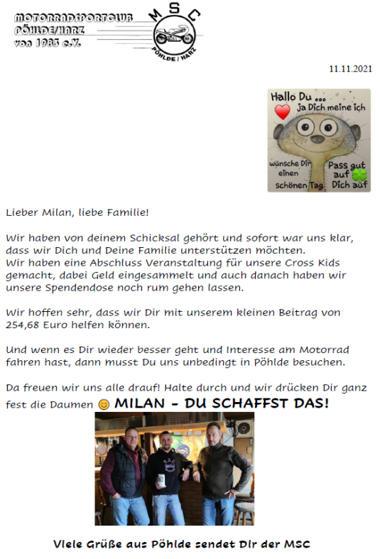 11.11.2021 Bei unserem Kidscross-Saisonabschluss und in unserem Vereinshaus haben wir Spenden für den kleinen vom Schicksal getroffenen Milan in Höhe von 254,68 € sammeln können. Das Geld wird nun der Familie gespendet, wir bedanken uns im Namen des MSC bei allen Spendern und wünschen Milan und seiner Familie Alles Gute!