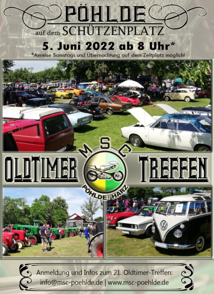 Einladung zum 25. Oldtimertreffen des MSC Pöhlde Hallo zusammen, liebe Freunde, Aussteller, Interessierte und Besucher. Wir möchten auch dieses Jahr mit Euch wieder unser Oldtimertreffen feiern und hoffen auf zahlreiche Besucher und Anmeldungen von Eurer Seite, damit es eine gelungene Veranstaltung wird!Hunderte von Fahrzeugen, Chrome, Blech und Schweiß warten auf uns Fans und Organisatoren. Wir können es kaum erwarten! Du hast einen Oldtimer? Motorrad, Tracktor, LKW, PKW, ganz egal, wir fühlen uns geehrt, wenn du uns mit deinem Oldtimer bereicherst! Um mit einem eigenen Oldtimer dabei zu sein, die meisten kennen es bereits, bitten wir dich, HIER die Anmeldung auszufüllen! Dies geht dieses Jahr vor allem digital und nimmt uns…