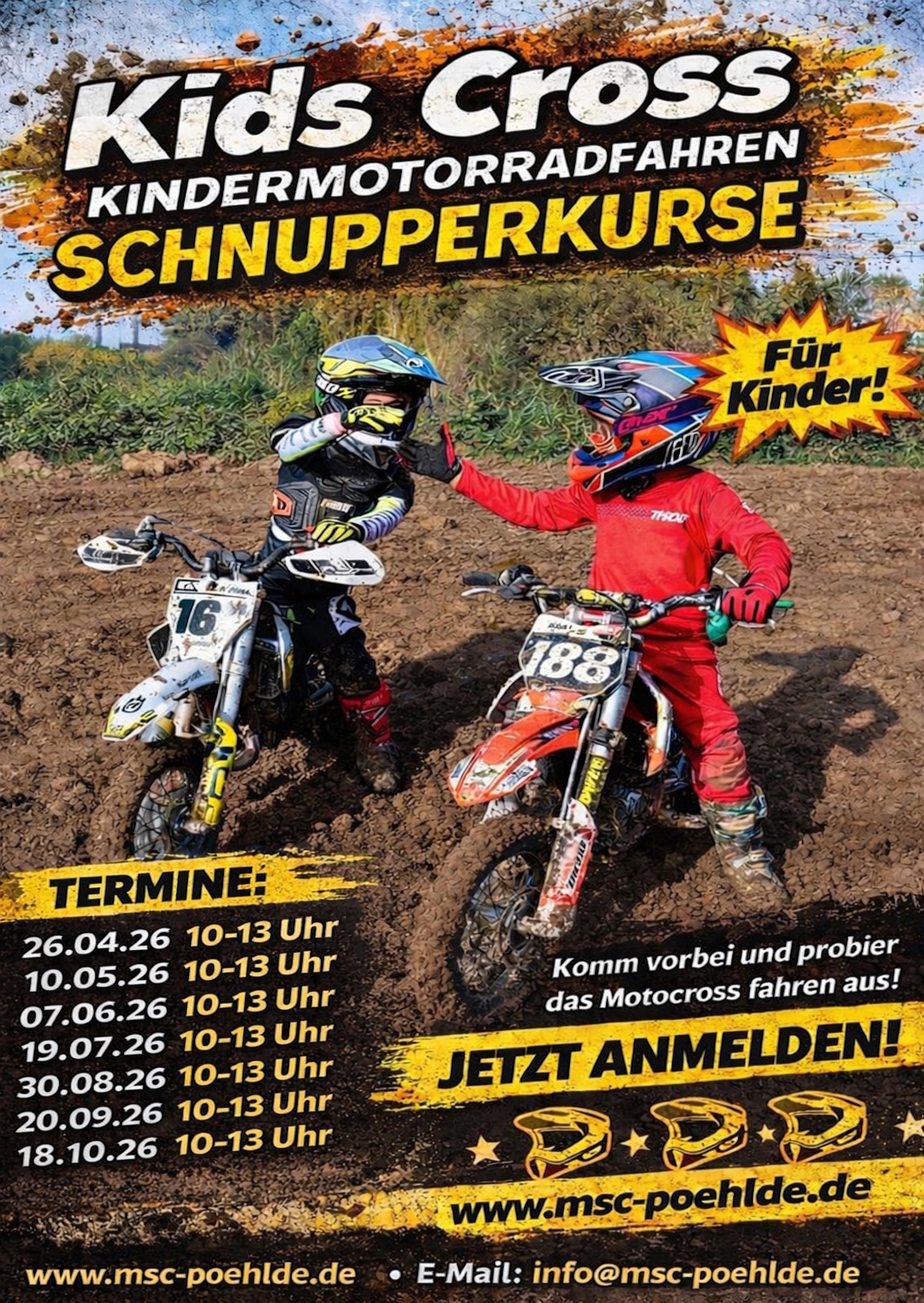 TERMIN AM 26.4. VOLL! Bitte für diesen Termin nicht weiter anmelden! Alle, die dabei sind, wurden per Email benachrichtigt! Vielen Dank, für Euer reges Interesse! Wer dieses Mal nicht dabei sein kann, sei nicht böse. Bitte für das nächste Mal wieder anmelden! Merci! Anmeldung für unser erstes Kids-Cross am 26.04.2026 um 10:00 Uhr bitte mit einer formlosen Email an: info@msc-poehlde.de Bitte bedenkt, dass wir aufgrund der Motorräder, des Equipments und auch der Lade-Infrastruktur der Motorräder begrenzte Kapazitäten haben und natürlich wollen wir auch individuell auf jeden eingehen. Den Ort werden wir mit der Bestätigung bekannt geben. Solltet ihr eine Absage erhalten, verstehen wir, wenn Ihr enttäuscht seid. Bitte probiert es…